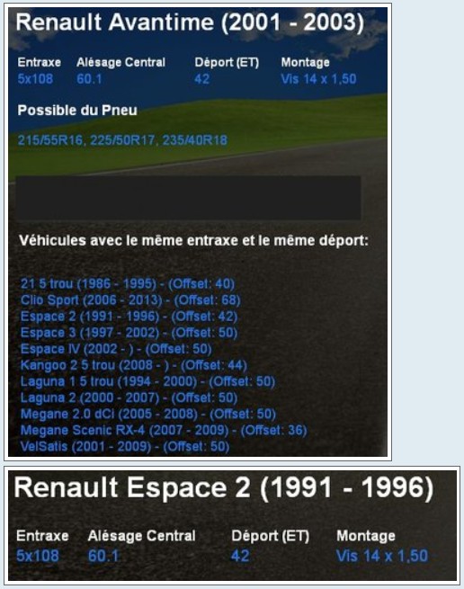 Sauf confusion, l'ET sur l'Avantime est de 42, et idem pour les jantes d'Espace II, mais ces 2mm de plus sont dans le "bon" sens et semble être des jantes de 21