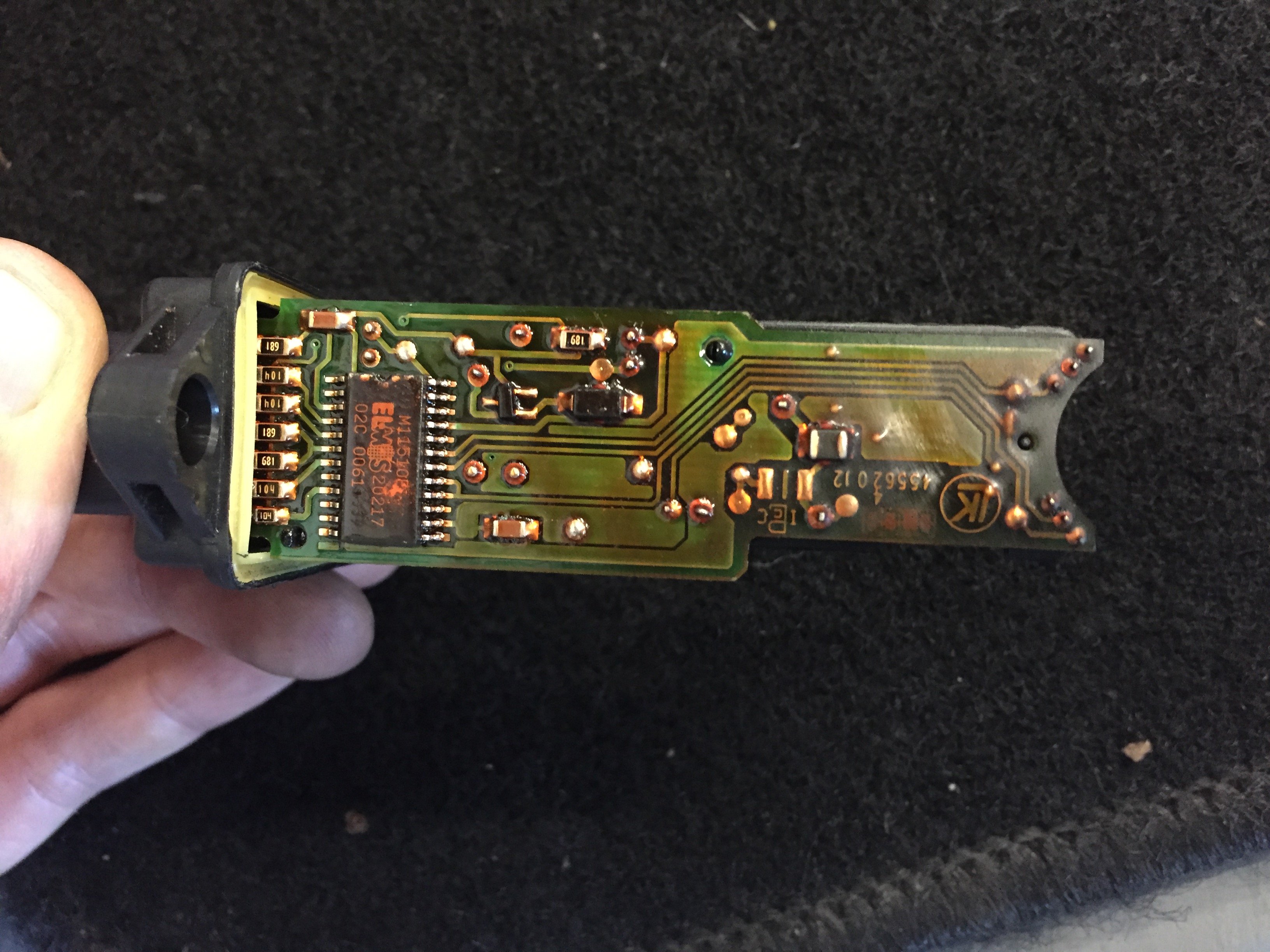 J'ai commencé à regarder mon histoire de vitre en démontant la contre porte droite. La connectique est bonne, le bouton fonctionne bien (testé au multi), toujours un petit clac. Du coup dépose du moteur complet. Je l'ai ouvert complètement pour voir dans quel état il était. Le moteur en lui même fonctionne très bien, ce qui est HS je pense c'est la carte électronique qui commande le moteur et sur lequel le connecteur vient se brancher. Quand on le secoue on entend un truc qui se promène dedans et en testant au multi, le 12V ne sort pas des contacts.