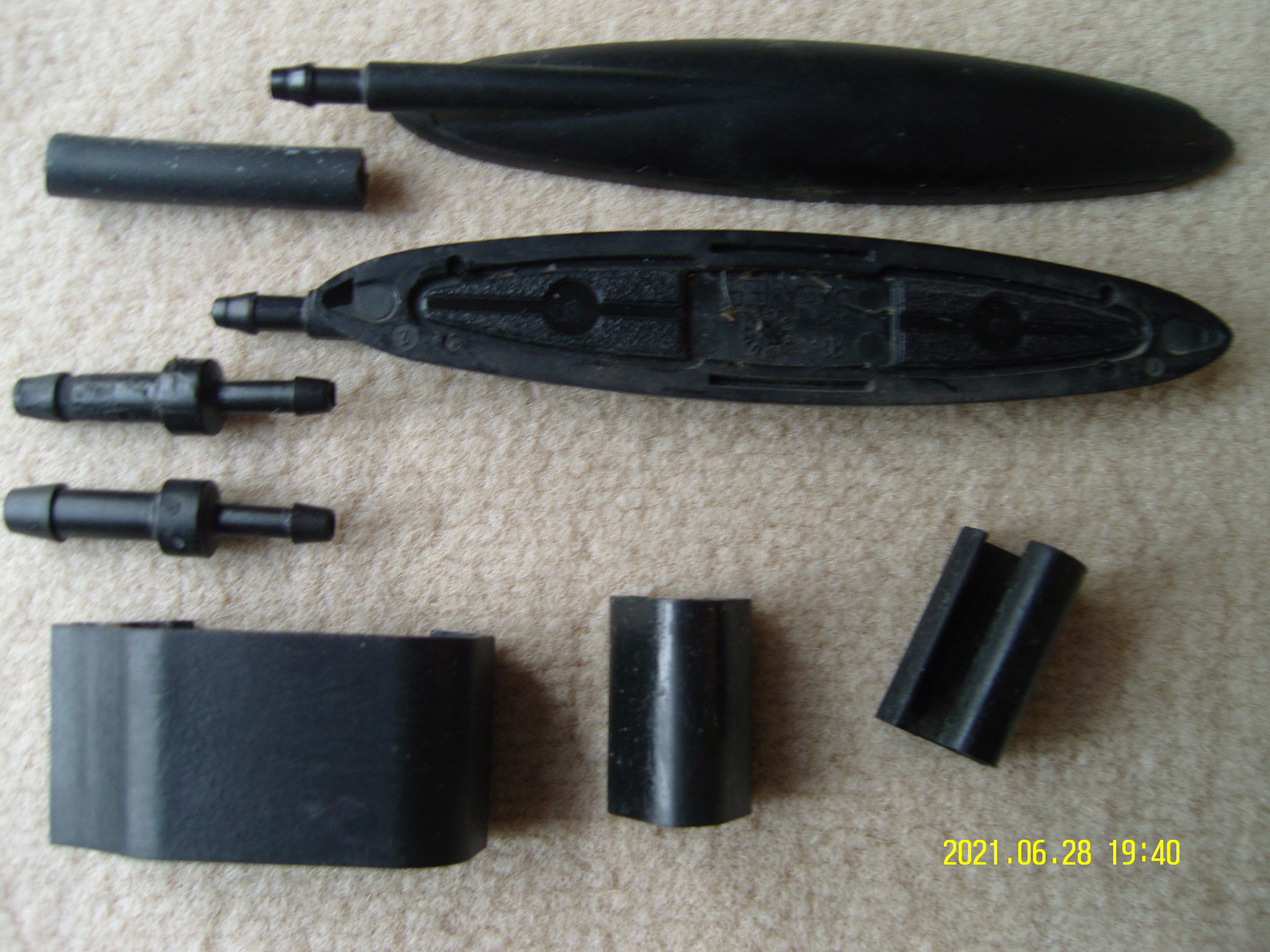 Les gicleurs d'origine, l'olive en sortie du tuyau d'entrée de la baie plastique noire, et des agrafes de tuyau sur les bras
