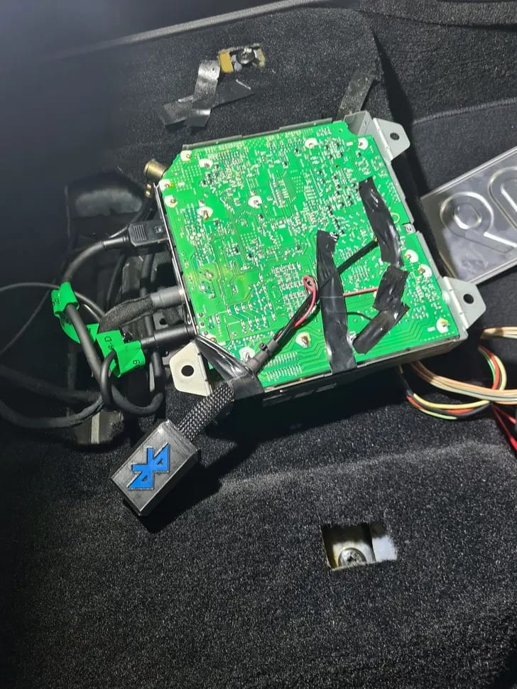 C'était il y a un moment, mais le module Bluetooth est bel et bien un produit polonais (micromarque). J'ai commandé la version sans connecteurs, juste les câbles de signal et d'alimentation. J'ai choisi ce module pour son excellente qualité sonore, sa longue portée et sa connexion instantanée au téléphone, en quelques secondes seulement. L'alimentation a été soudée à un point de la carte qui ne reçoit de tension que lorsque le contact est mis. Les câbles de signal ont quant à eux été connectés conformément au tutoriel d'installation du connecteur auxiliaire. Malheureusement, je n'ai pas de photos détaillées, et le ruban isolant sur la photo a été appliqué pendant la phase de test pour protéger les câbles d'un retrait accidentel, et non pour des raisons de confidentialité. J'en fabriquerai certainement un autre jeu un jour, car j'ai une radio de rechange ; je documenterai ensuite tout cela pour aider les autres passionnés d'Avantime.
