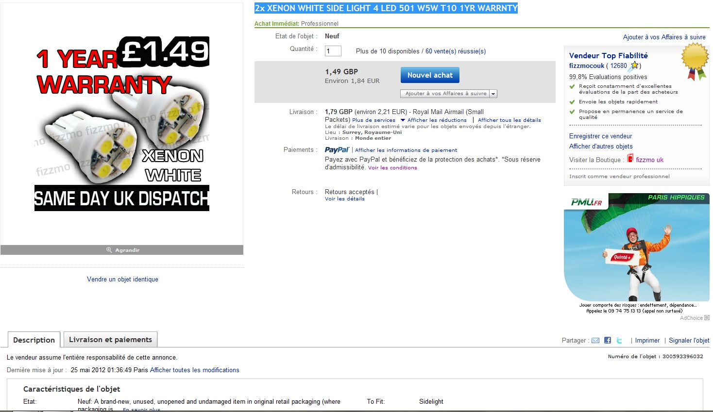Voici celles que j'ai acheté : 2x XENON WHITE SIDE LIGHT 4 LED 501 W5W T10 1YR WARRNTY, environ 9,57€ les 8 fdp inclus... Si vous avez des leds à conseiller, je suis preneur...