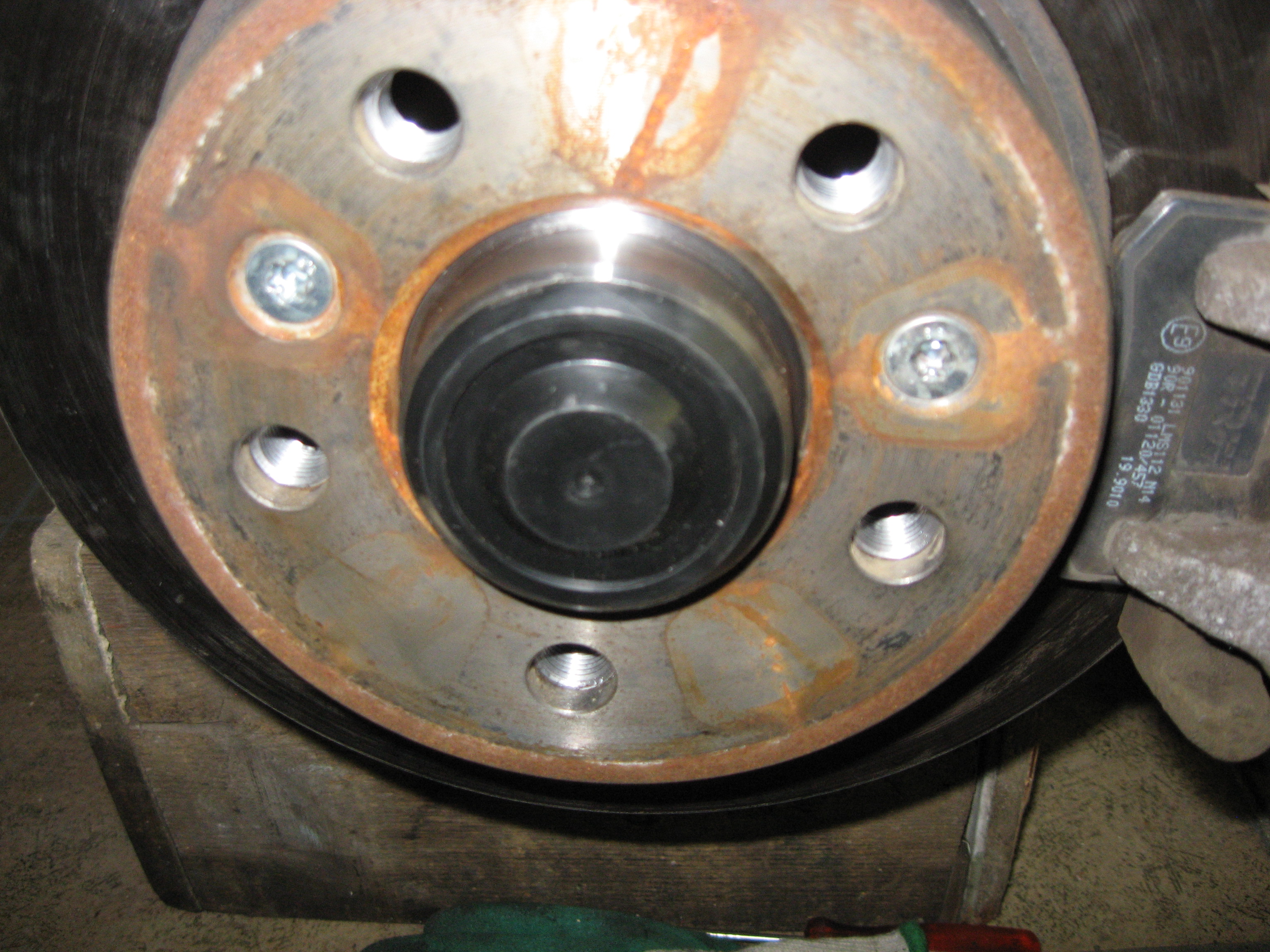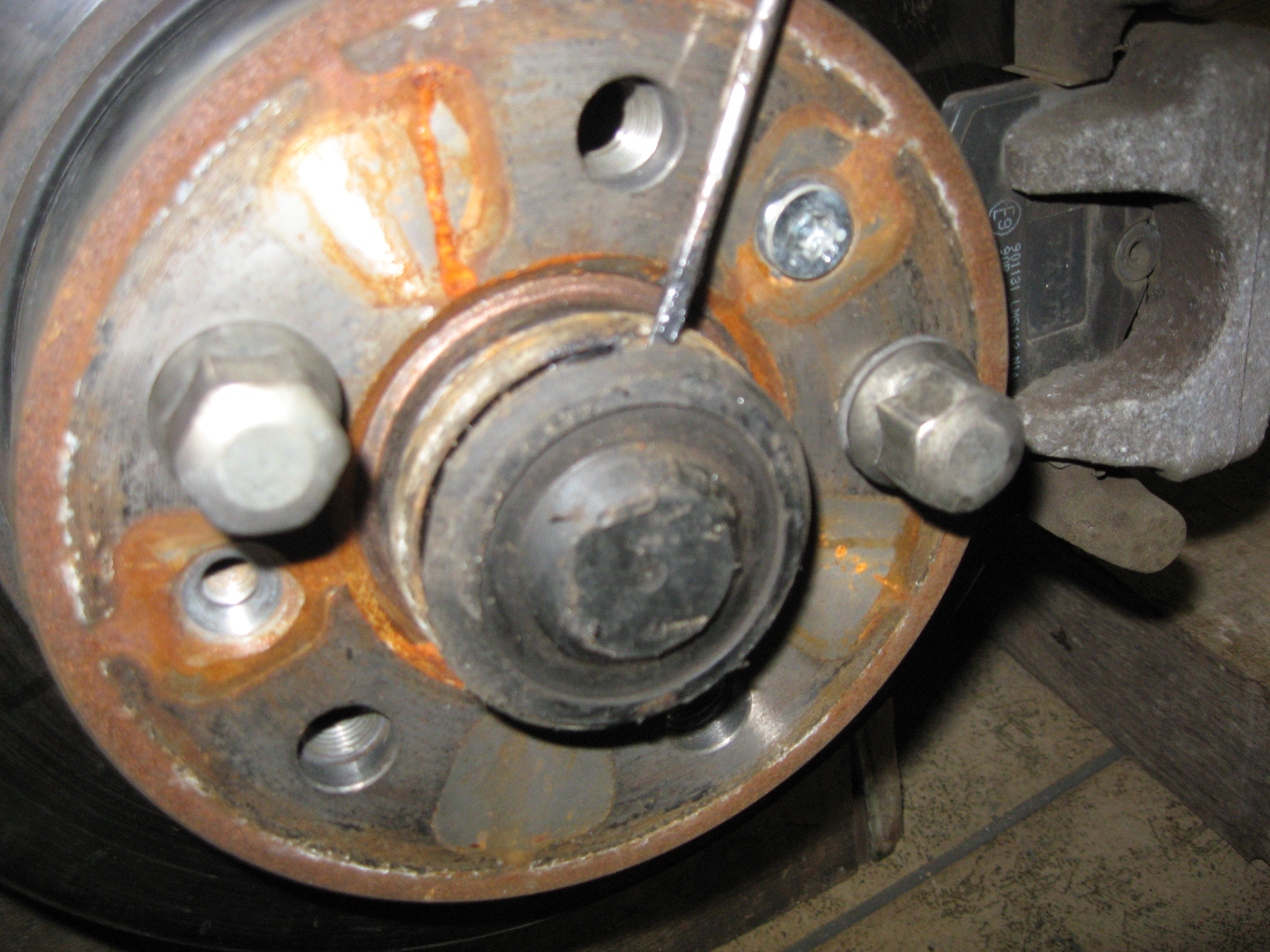 - Enlever les vis de tenue du disque ( 2 torx ), j'ai remis deux vis de roue et tiré le frein à main pour bloquer le disque et j'ai enlevé le cabochon avec un tournevis .