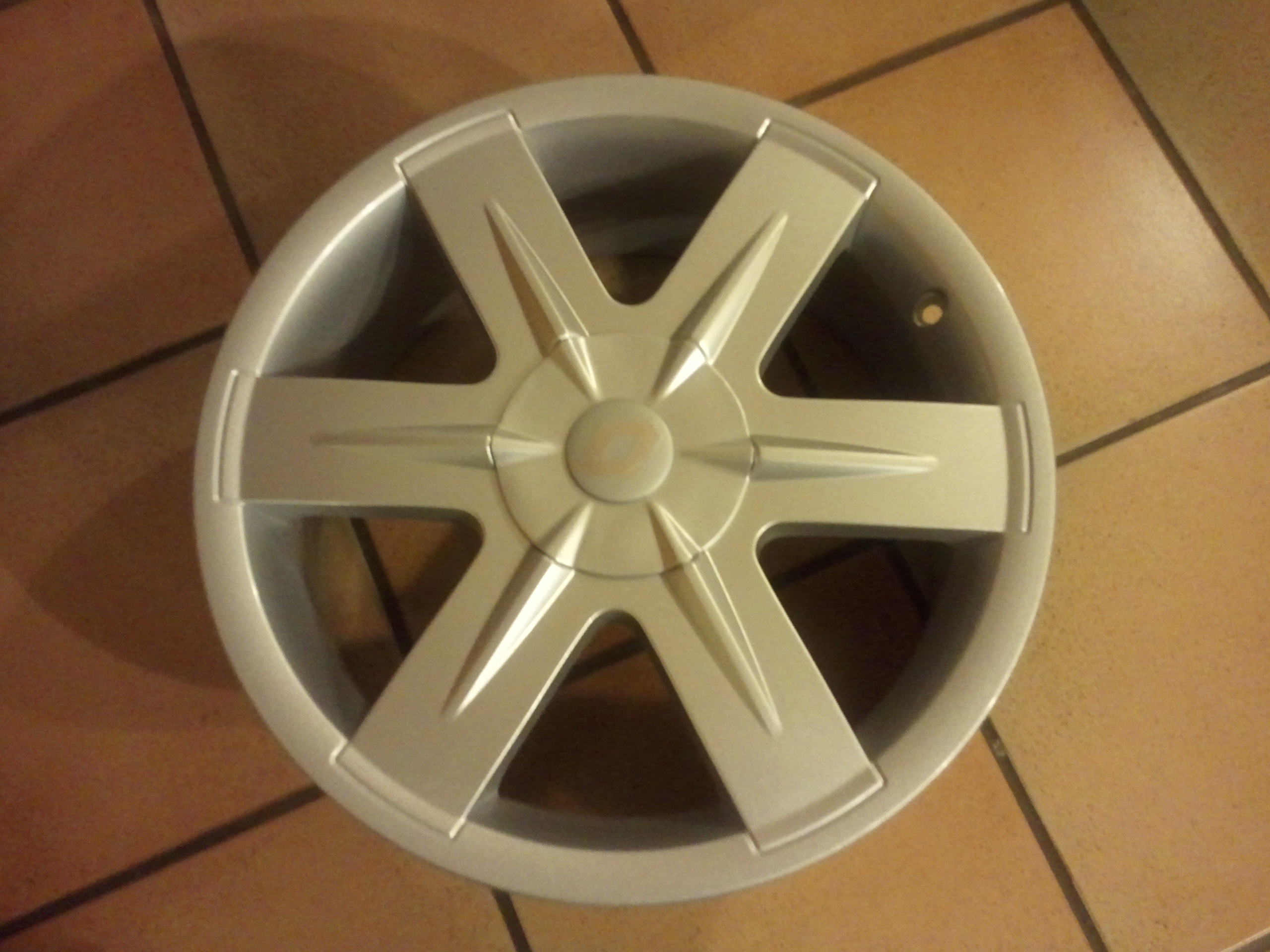 Celui ci est déjà en fibre de verre pas vernis juste un coup de gris pour voir, j'ai fabriqué un prototype en carton et plâtre, puis j'ai fait un moule en plâtre. Le problème c'est qu'il faut des cache-moyeu avec clipsage 55mm, j'en ai acheté 4, pour une fixation correcte comme d'origine.