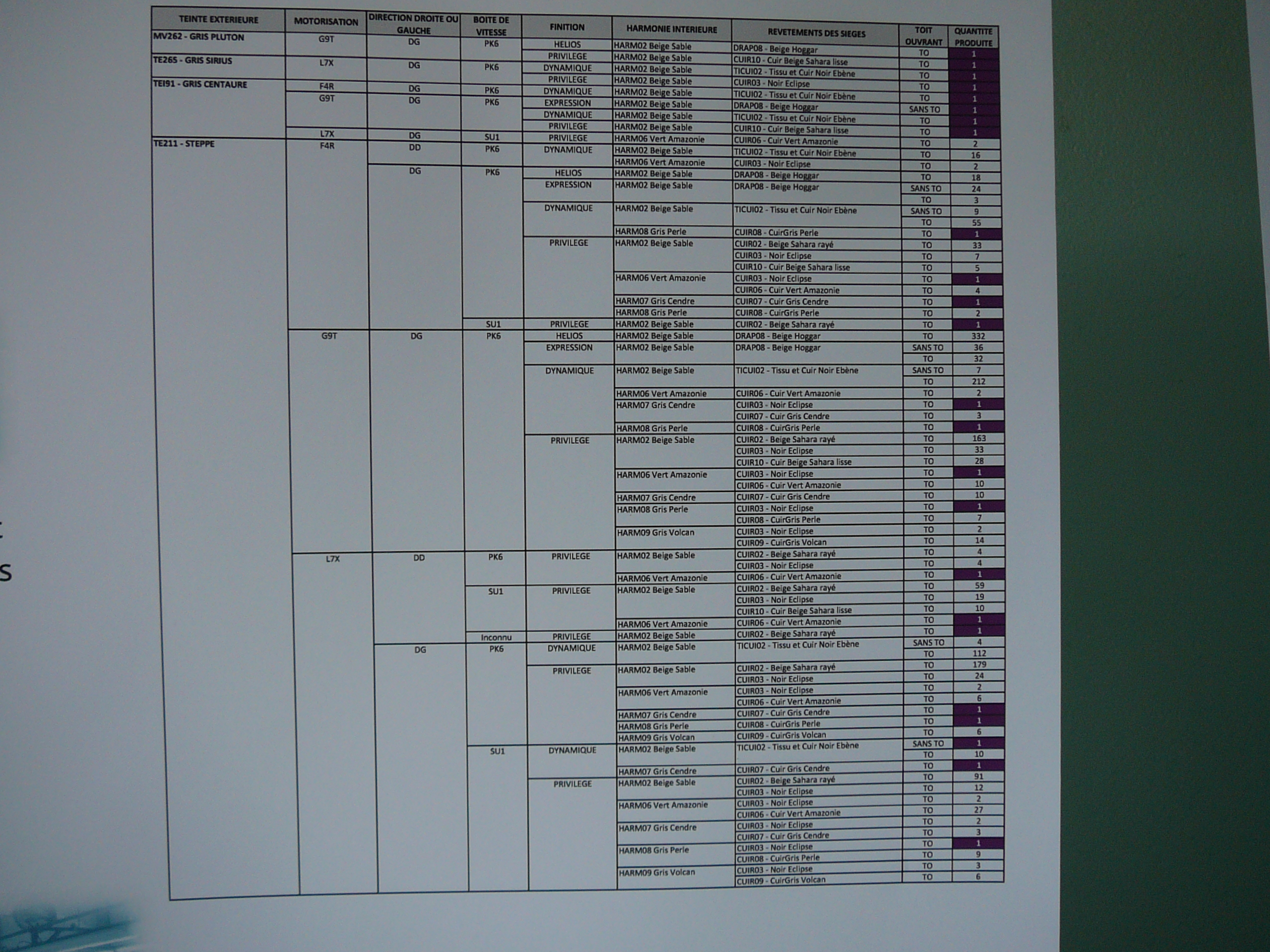 Voici les tableaux de la répartition par moteur, finition, couleur, etc .....