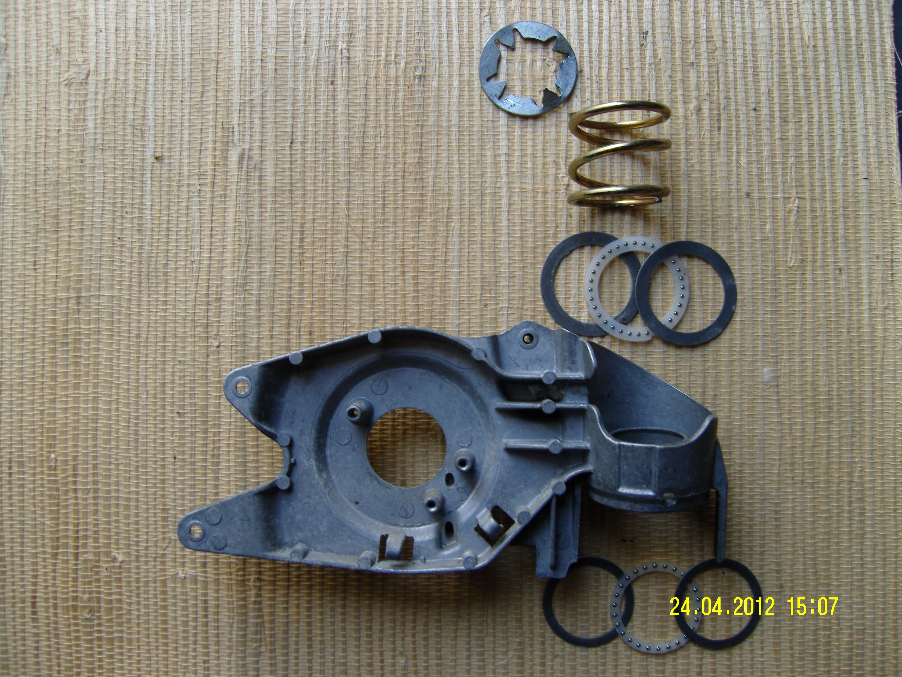En haut la rondelle à griffes, difficile à extraire sans la casser pour ré-emploi. La platine porte-miroir et les 2 butées à billes, ainsi que le ressort de compression autorisant le déboitement accidentel.
