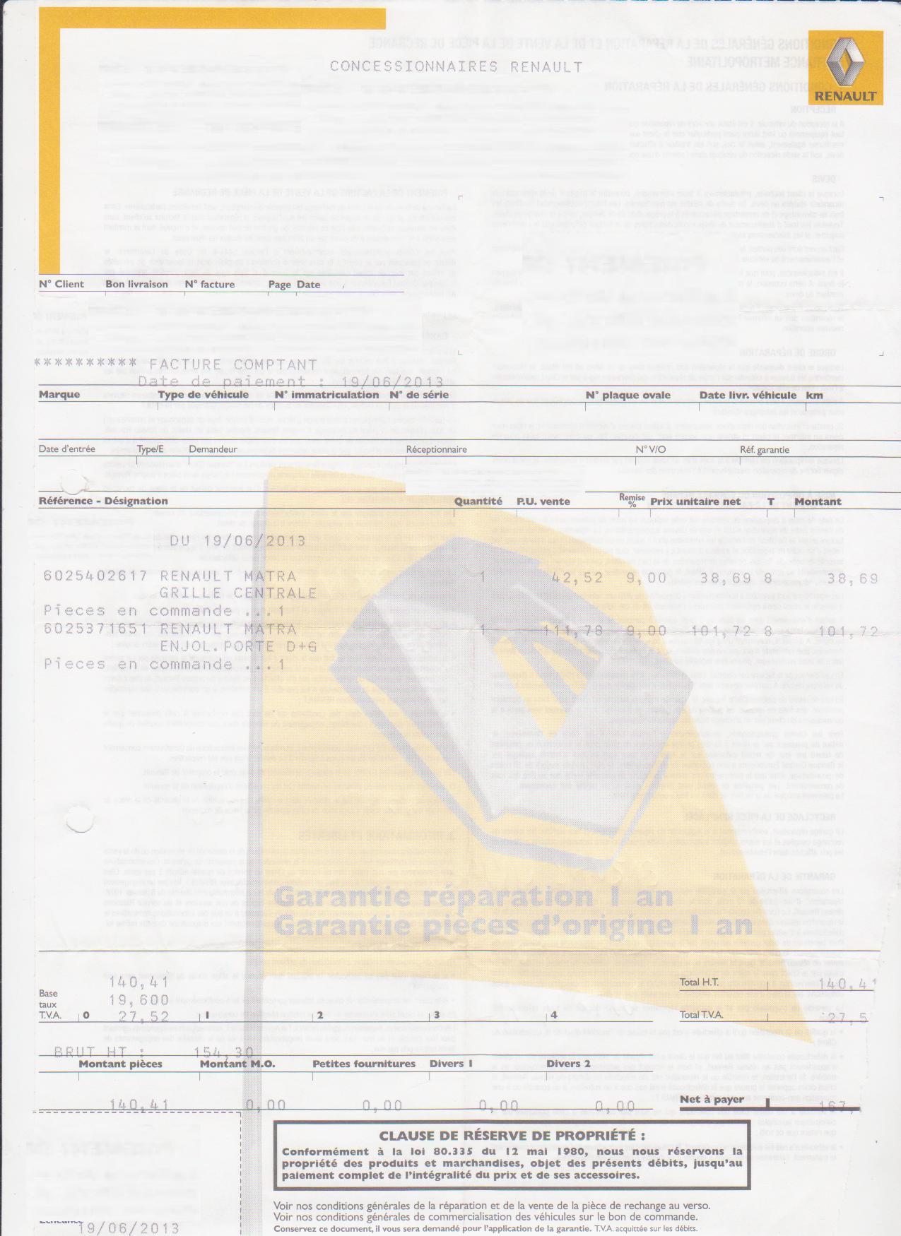 Voici la facture de la grille 45.76€ en juin 2013, et la facture des poignées que j'ai jamais reçues.