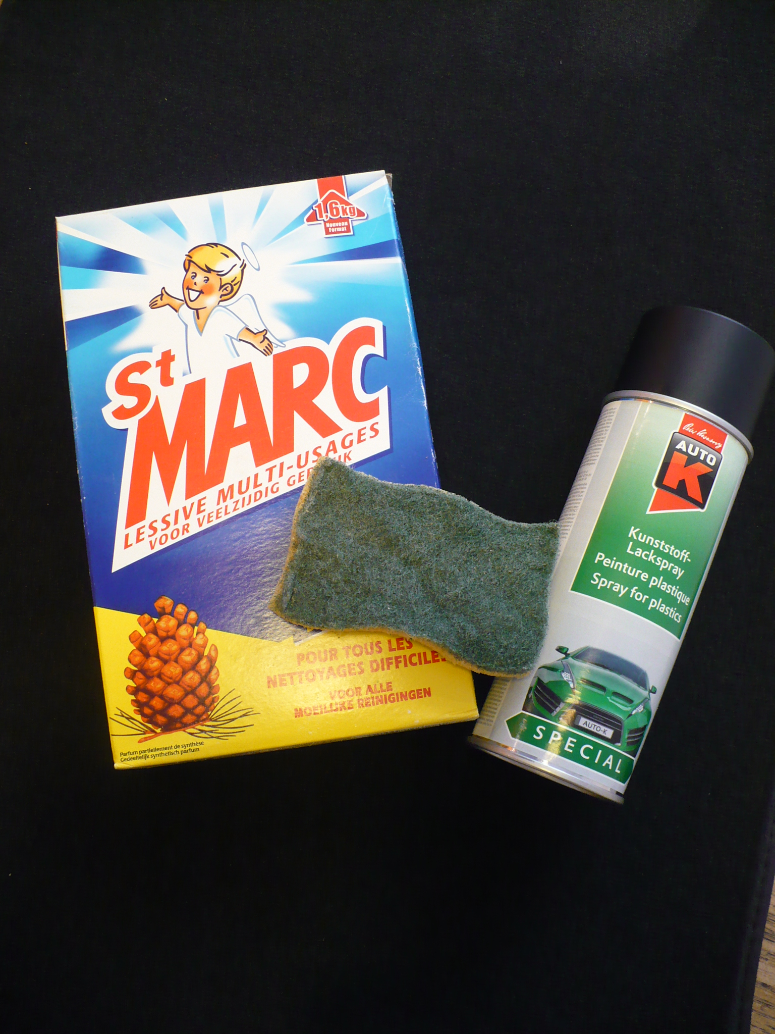 - Une bombe de peinture noire pour plastiques (en centre auto) ou bien de la peinture normale mais avec une sous couche pour plastique sinon la peinture finira par cloquer.